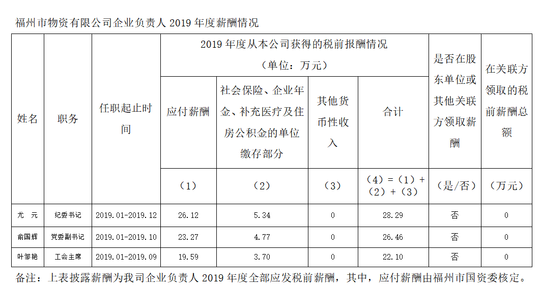 福州市物資有限公司企業(yè)負責人2019年度薪酬信息披露公告